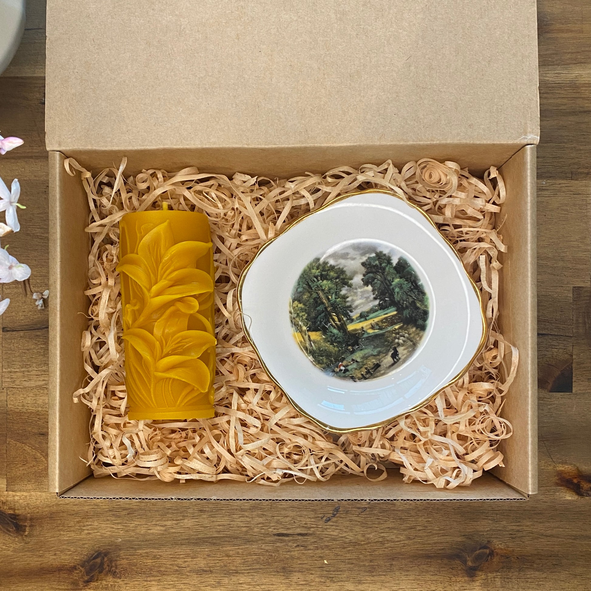 Lovingly hand-poured from locally sourced pure beeswax, this Lilly pillar candle comes with a delicate collected Country scene plate, providing a charming base to showcase your candle